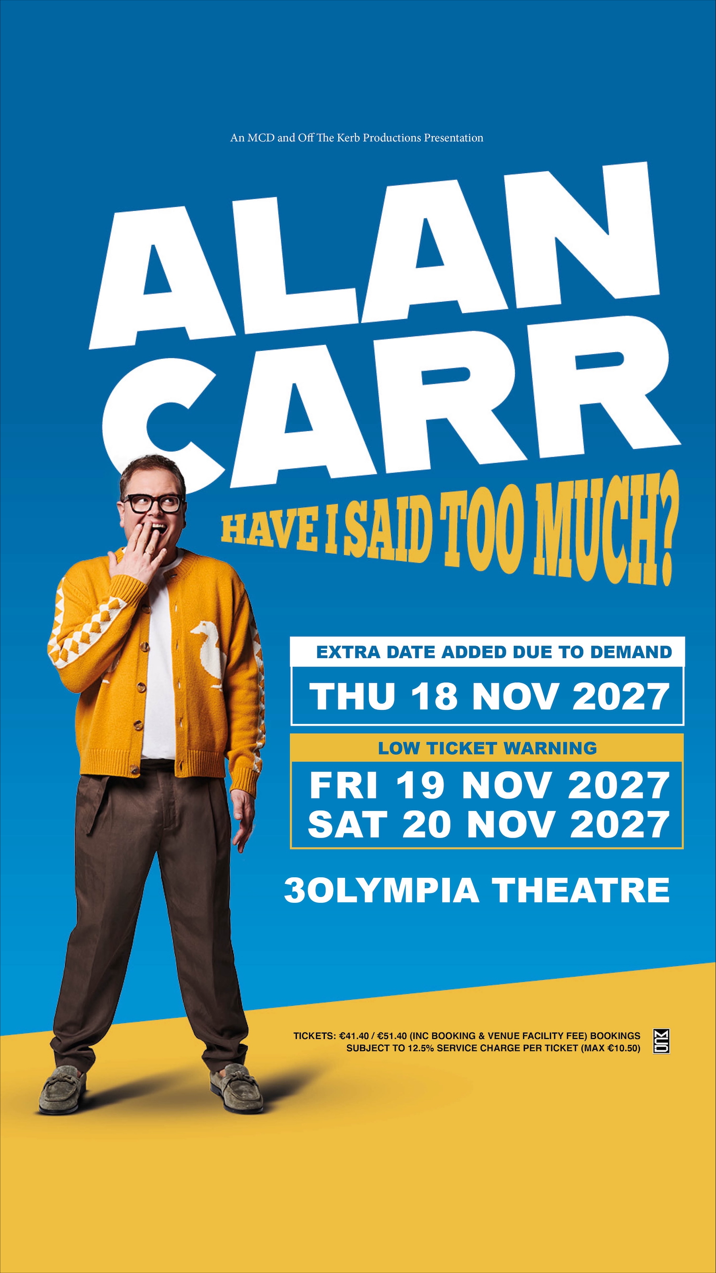Alan Carr brings his Have I Said Too Much? Tour to 3Olympia Theatre, Dublin on Friday 19th November & Saturday 20th November 2027.