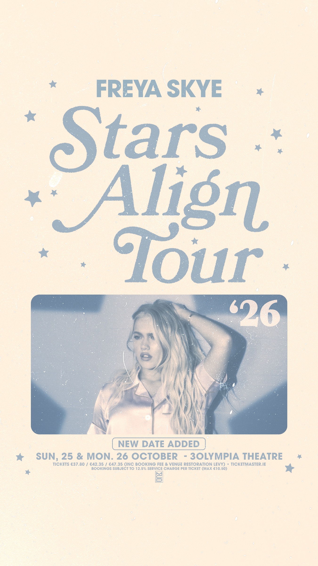 Due to demand, British singer-songwriter Freya Skye has announced a second show in 3Olympia Theatre, Dublin on Monday 26th October 2026 as part of her Stars Align Tour, along with her first date Sunday 25th October 2026.