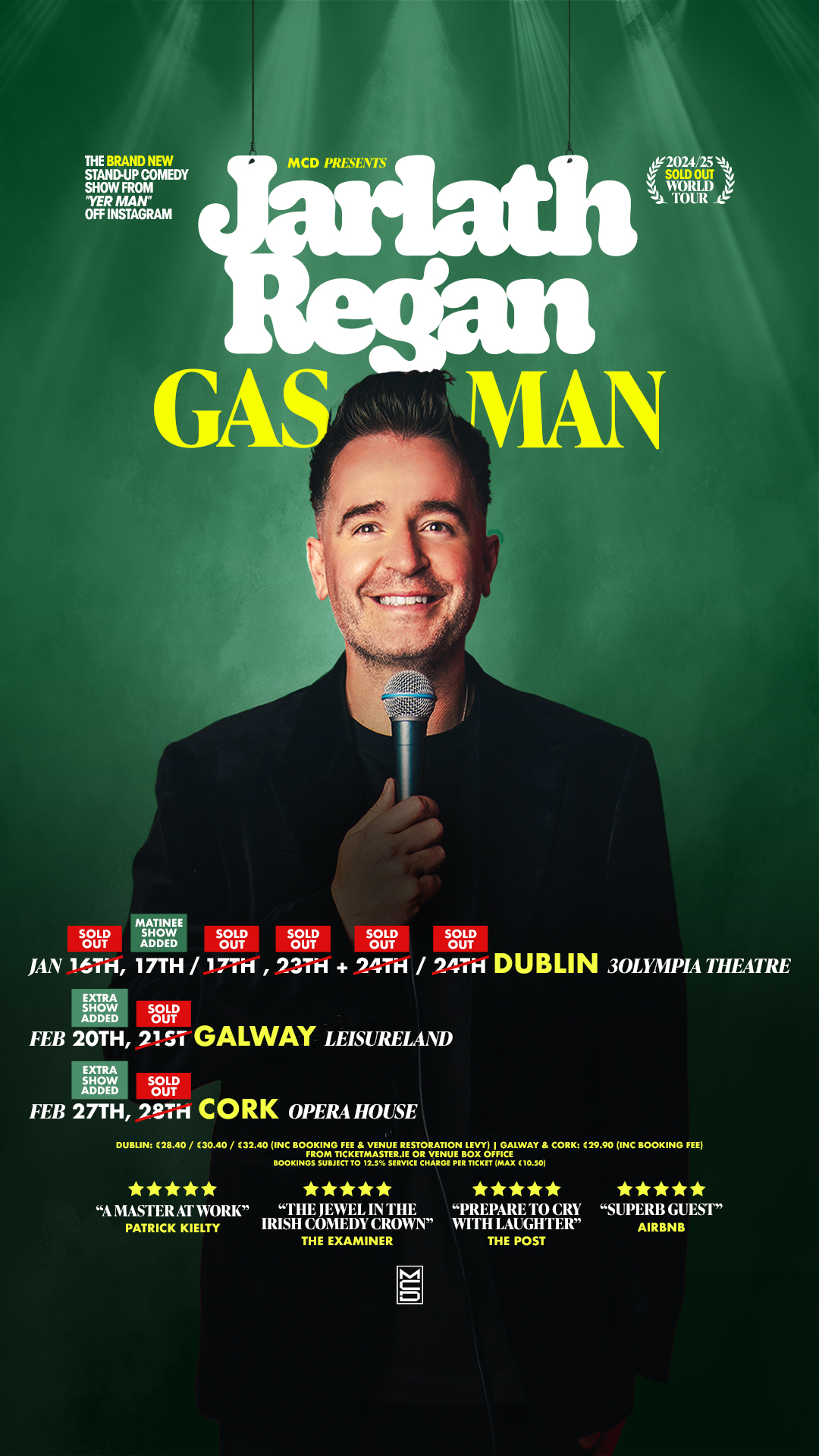 The Viral Comedy King, Jarlath Regan, announces his 2026 World Tour, with this brand-new stand-up show Gas Man, will come to Dublin’s 3Olympia Theatre in January 2026.