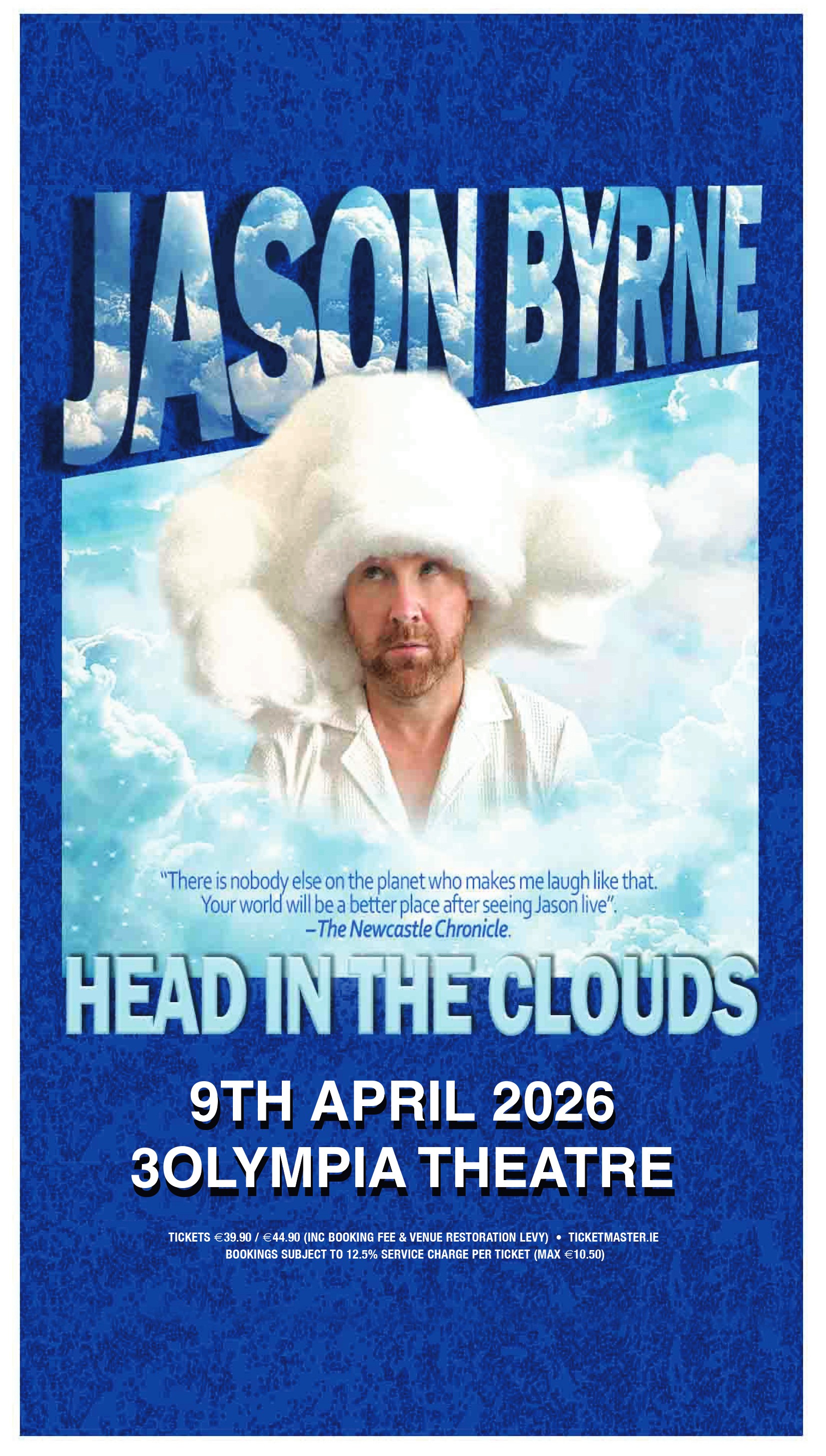 Jason Byrne’s inspired, original brand of high-energy intelligent lunacy returns to 3Olympia Theatre on Thursday 9th April 2026 with his brand new show live show Head In The Clouds.