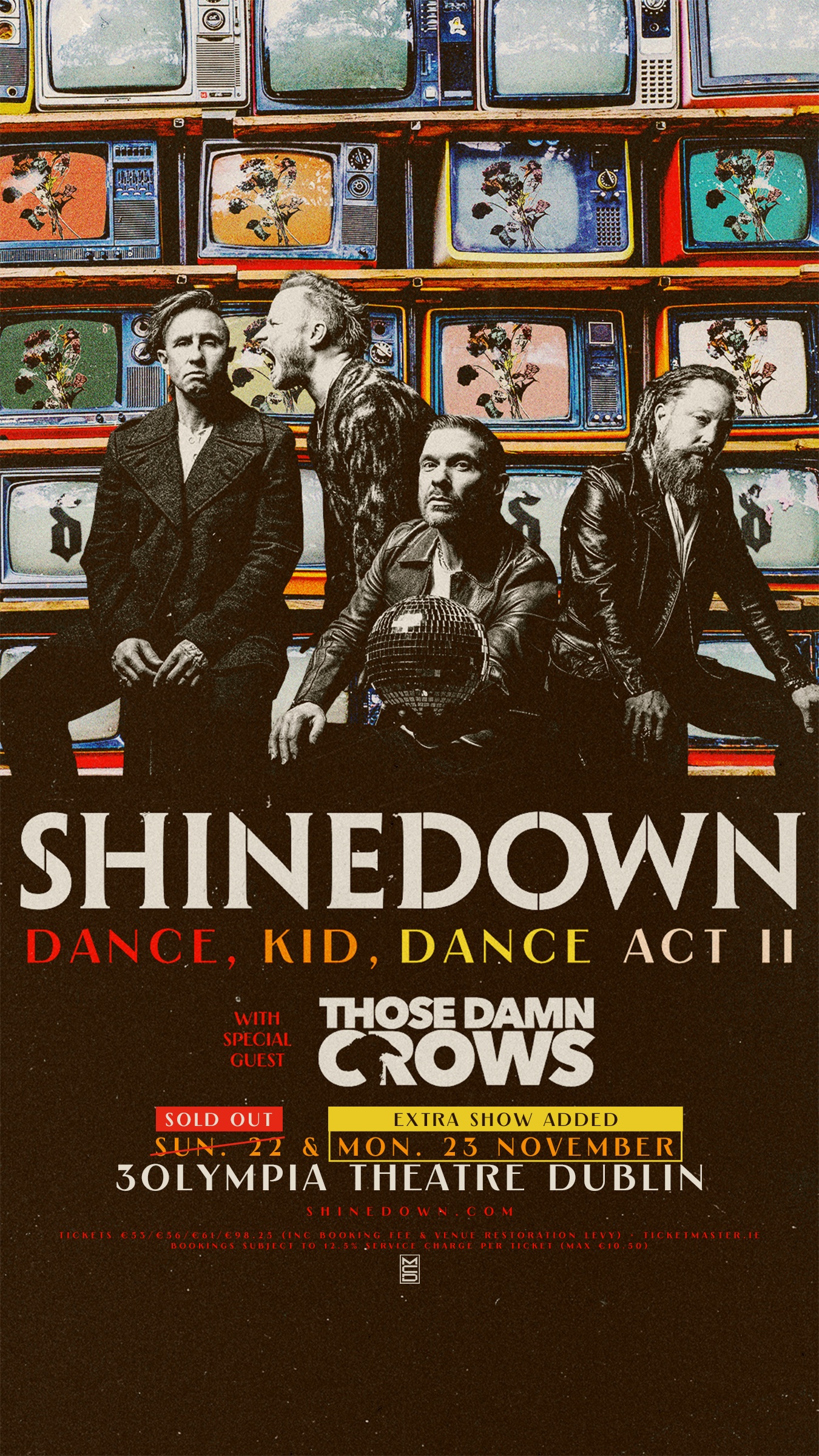 Multi-platinum band Shinedown have announced they’ll bring their Dance, Kid, Dance Act II Tour to 3Olympia Theatre, Dublin on Sunday 22nd November 2026, where they will be joined by Those Damn Crows.