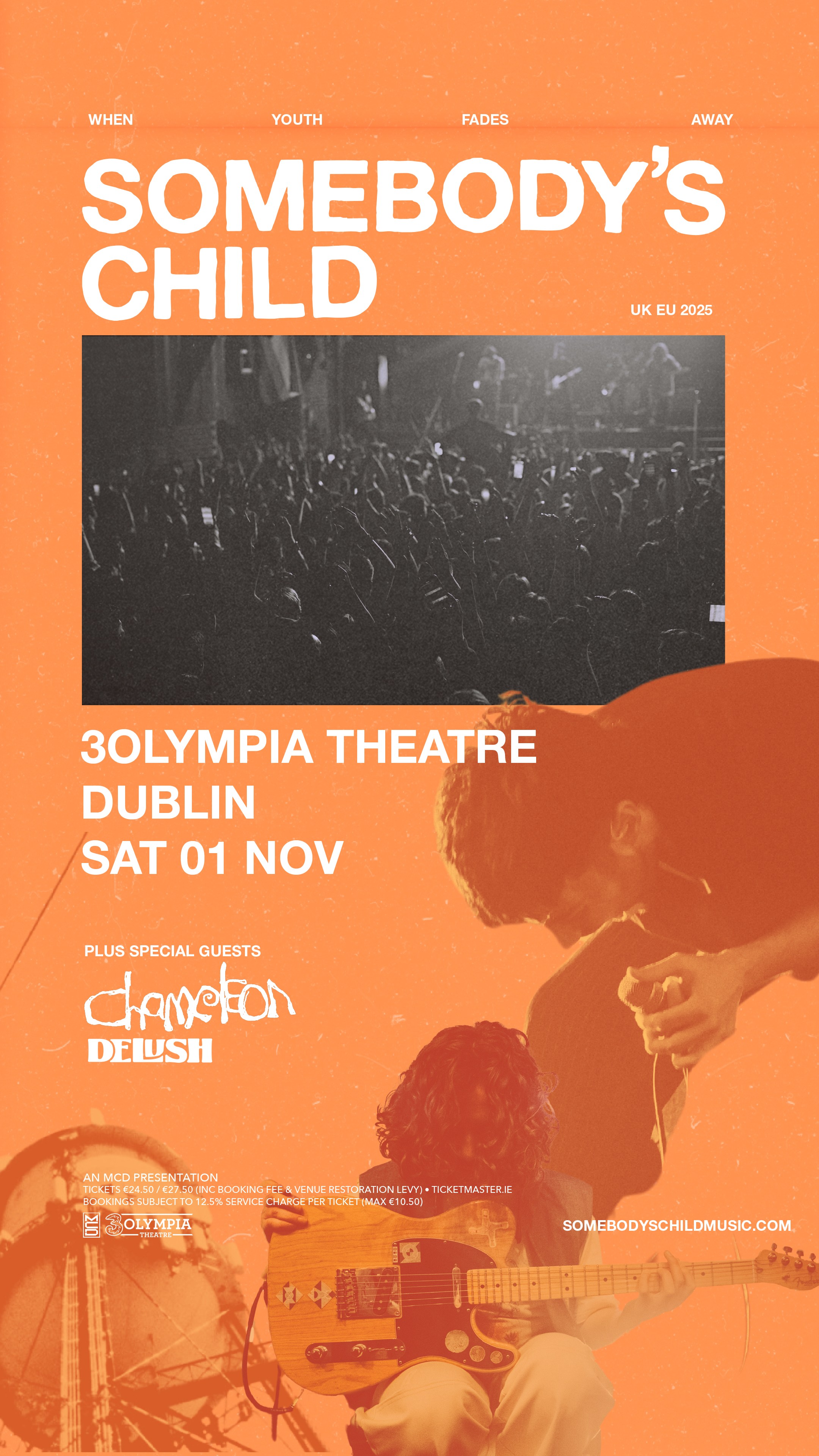 Determined to evolve beyond indie-rock conventions, Somebody’s Child are constantly pushing their creative boundaries. Their second album, When Youth Fades Away, recorded in Connecticut with Grammy-winning producer Peter Katis (The National, Interpol), sees them exploring new sonic territory, influenced in part by electronic pioneers like Kraftwerk. The record embraces change both sonically and thematically, reflecting on the realities of growing older - not with nostalgia, but with a hunger for reinvention. As Godfrey puts it, “There is no Somebody’s Child - it’s just a figment of our imaginations allowing us to process our lives.”
